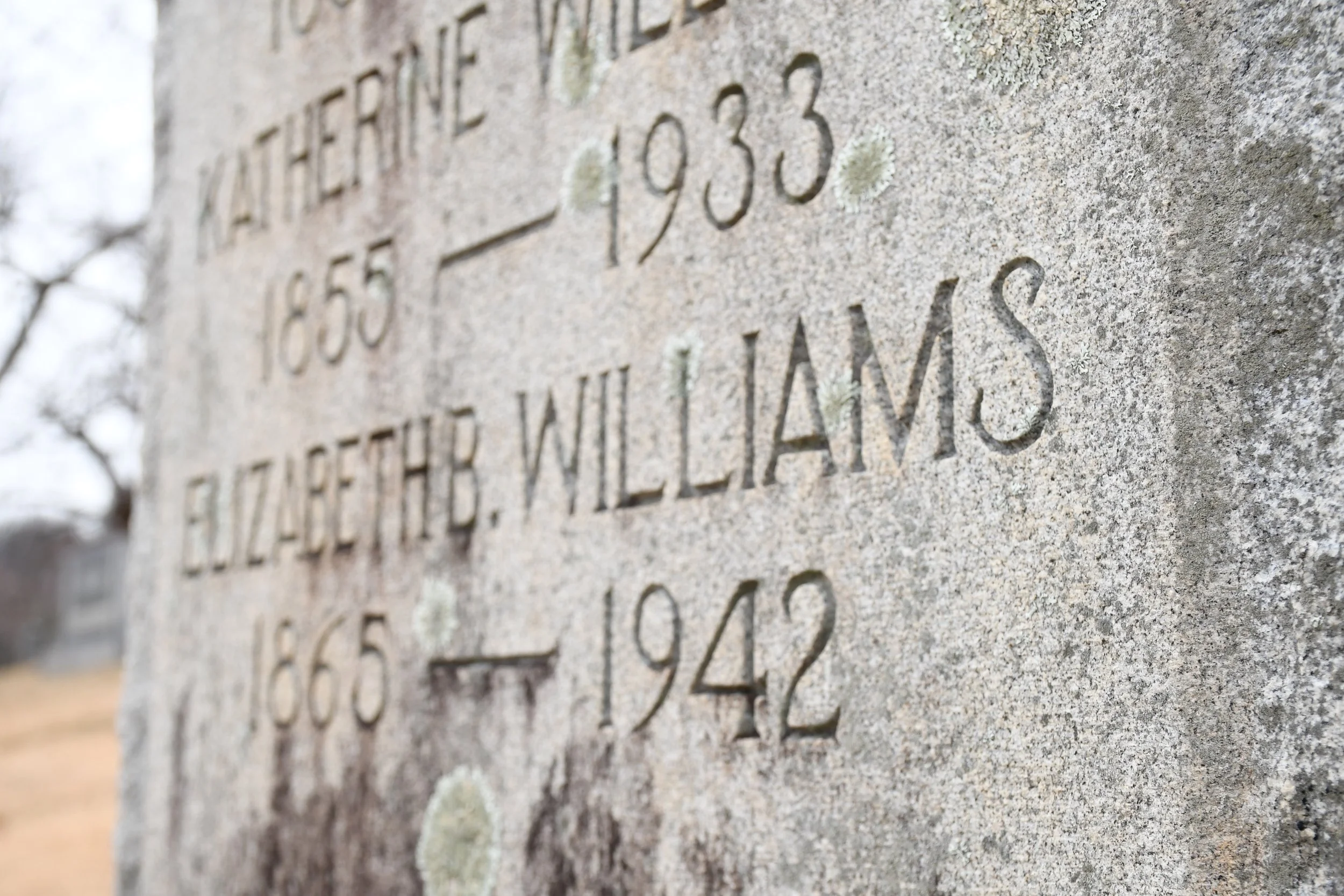 Image of gravestone heading “ELIZABETH B. WILLIAMS 1865-1942” at One Focus Church in Swannanoa, N.C., on Jan. 30 2026. (Echo News/Richmond Joyce)