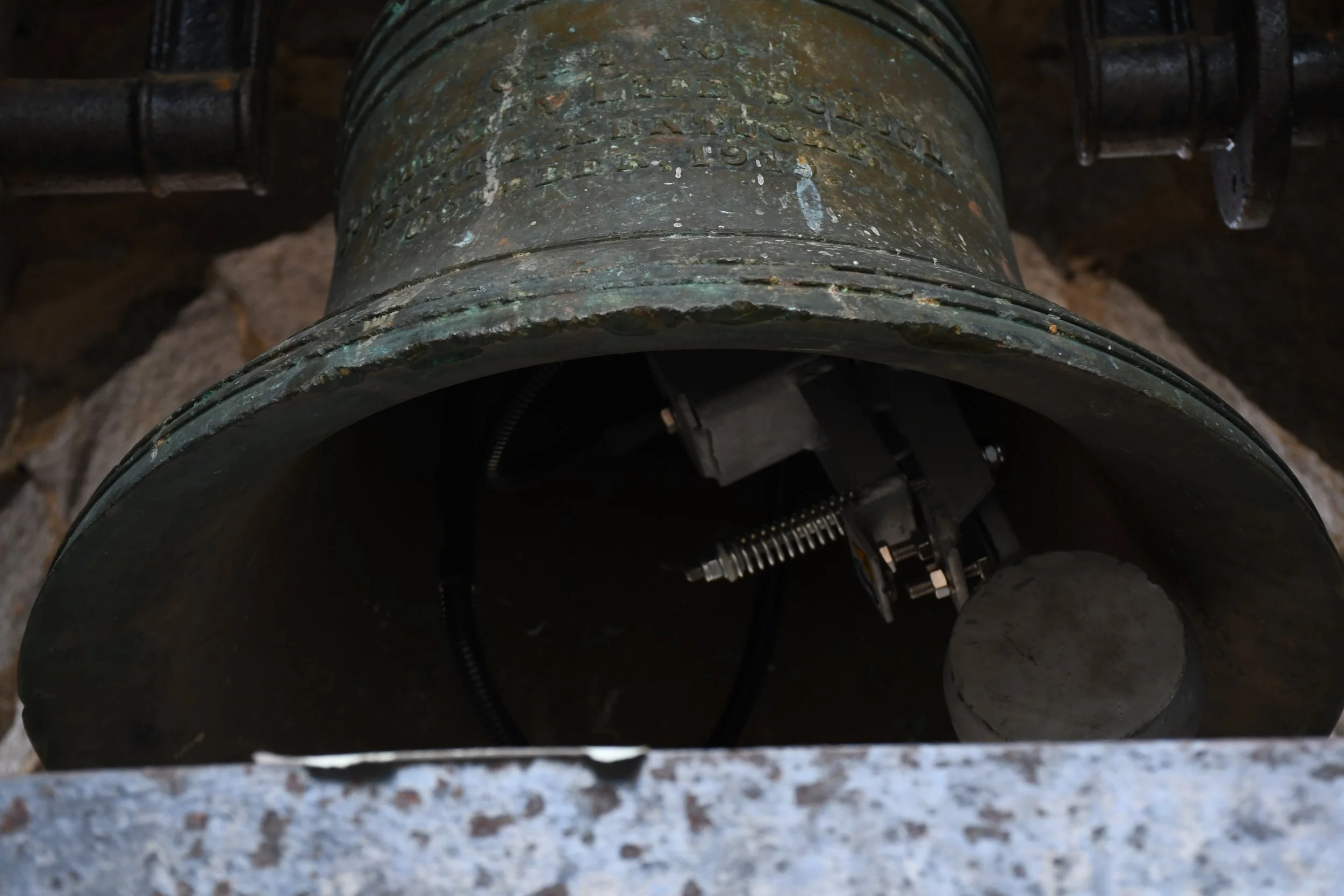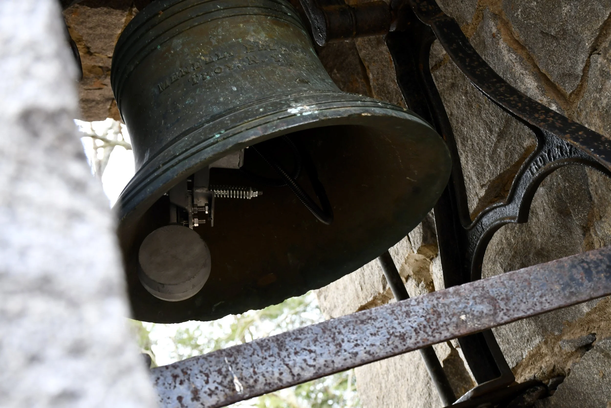 Close-up image of bell with chiming mechanism in stone tower with text reading “MENELLY BELL CO. TROY, N.Y.” on Warren Wilson College (WWC) campus in Swannanoa, N.C., on Jan. 23, 2026. (Echo News/Richmond Joyce)