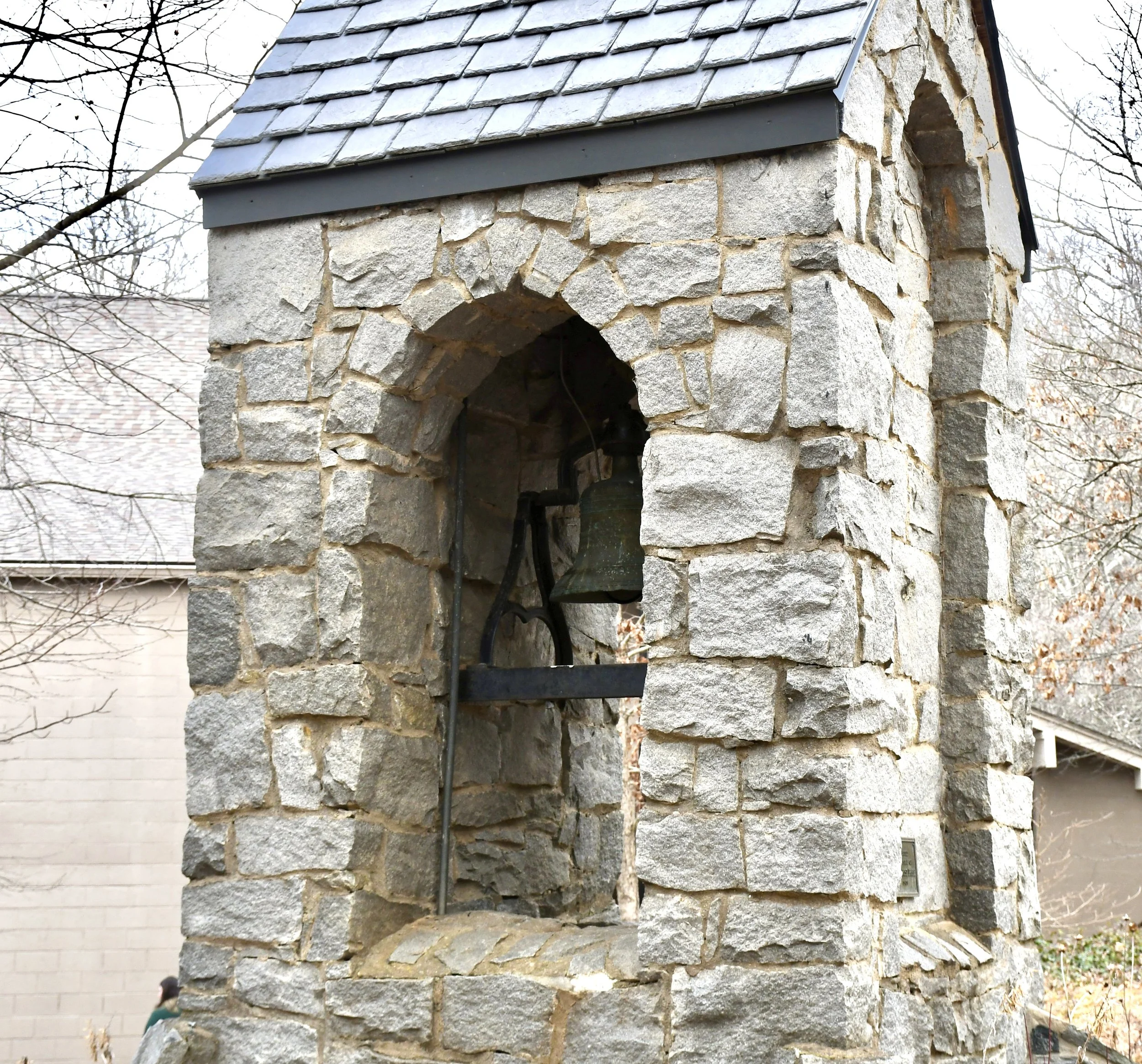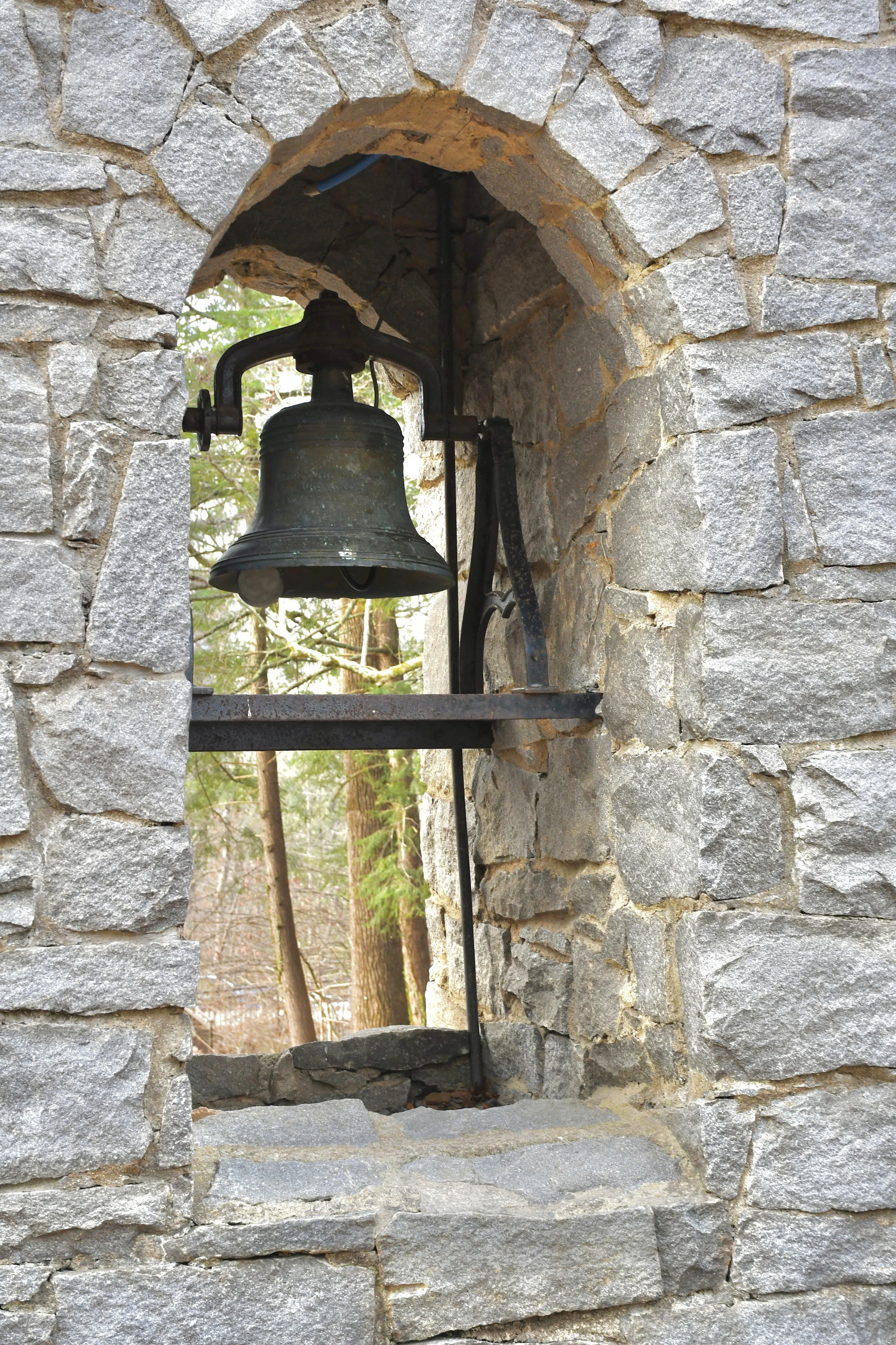 Vertical image of bell with patina in stone tower on Warren Wilson College (WWC) campus in Swannanoa, N.C., on Jan. 23, 2026. (Echo News/Richmond Joyce)