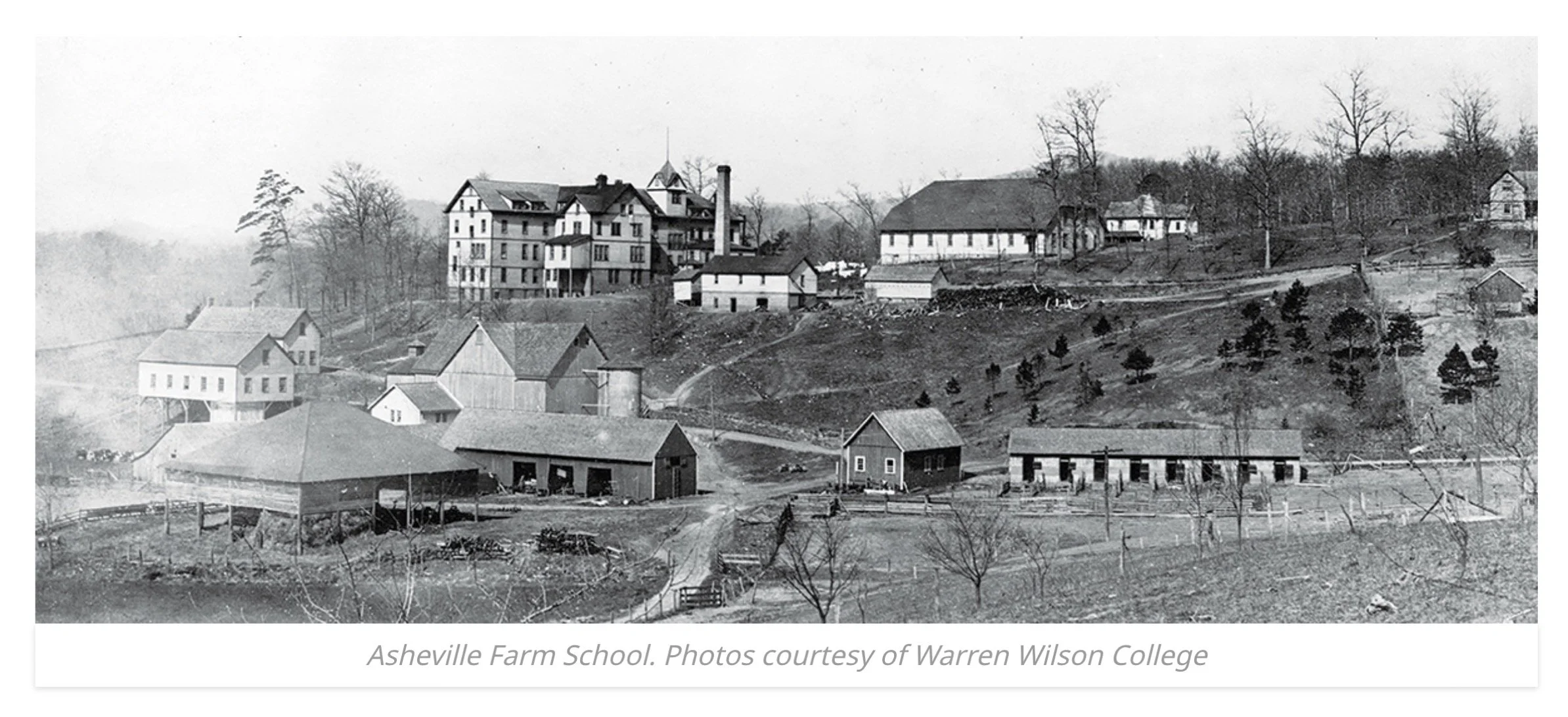 Archival photograph of Asheville Farm School with “Old Main” present as large white building on top of hill.