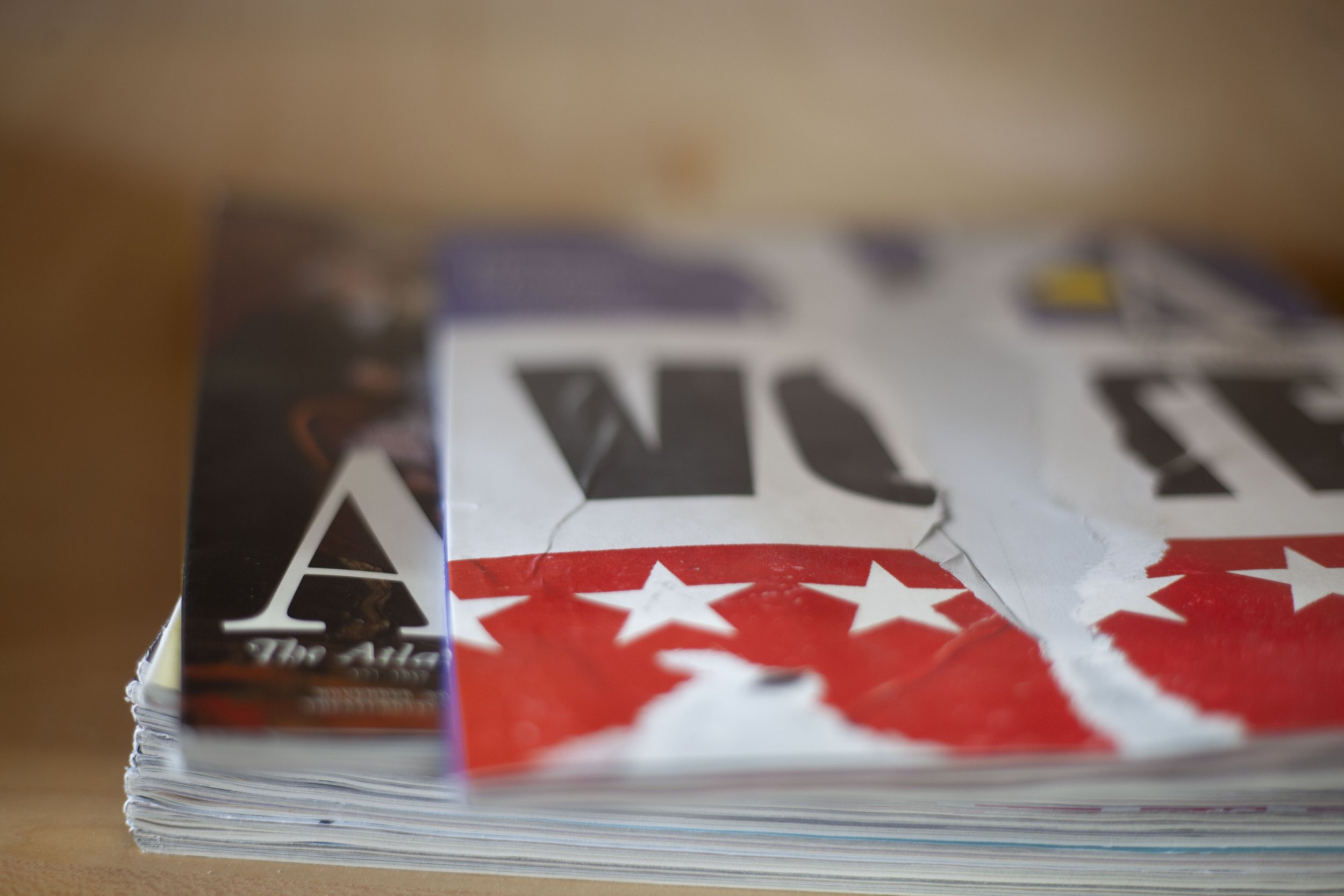 A stack of magazines including issues of The Atlantic in the Pew Learning Center and Ellison Library at Warren Wilson College, on Jan 28, 2026 in Swannanoa, N.C. (Emma Taylor McCallum/Echo)
