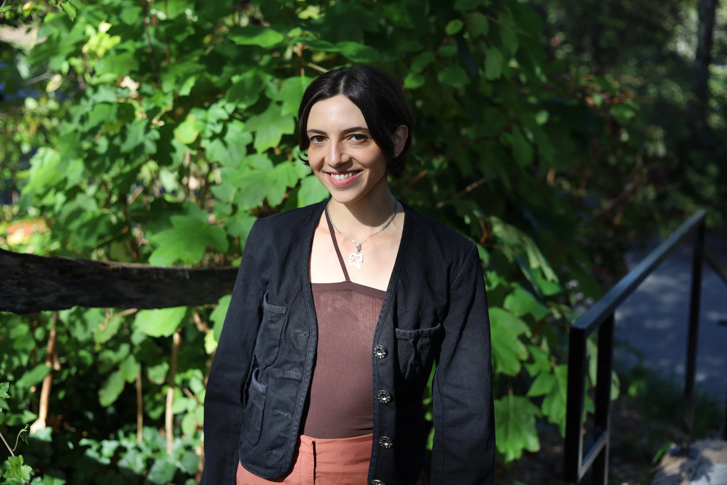 Visiting assistant professor Sarah Sgro poses for a picture outside of Jensen Hall at Warren Wilson College in Swannanoa, N.C.. (Echo/Neko Heinrich)