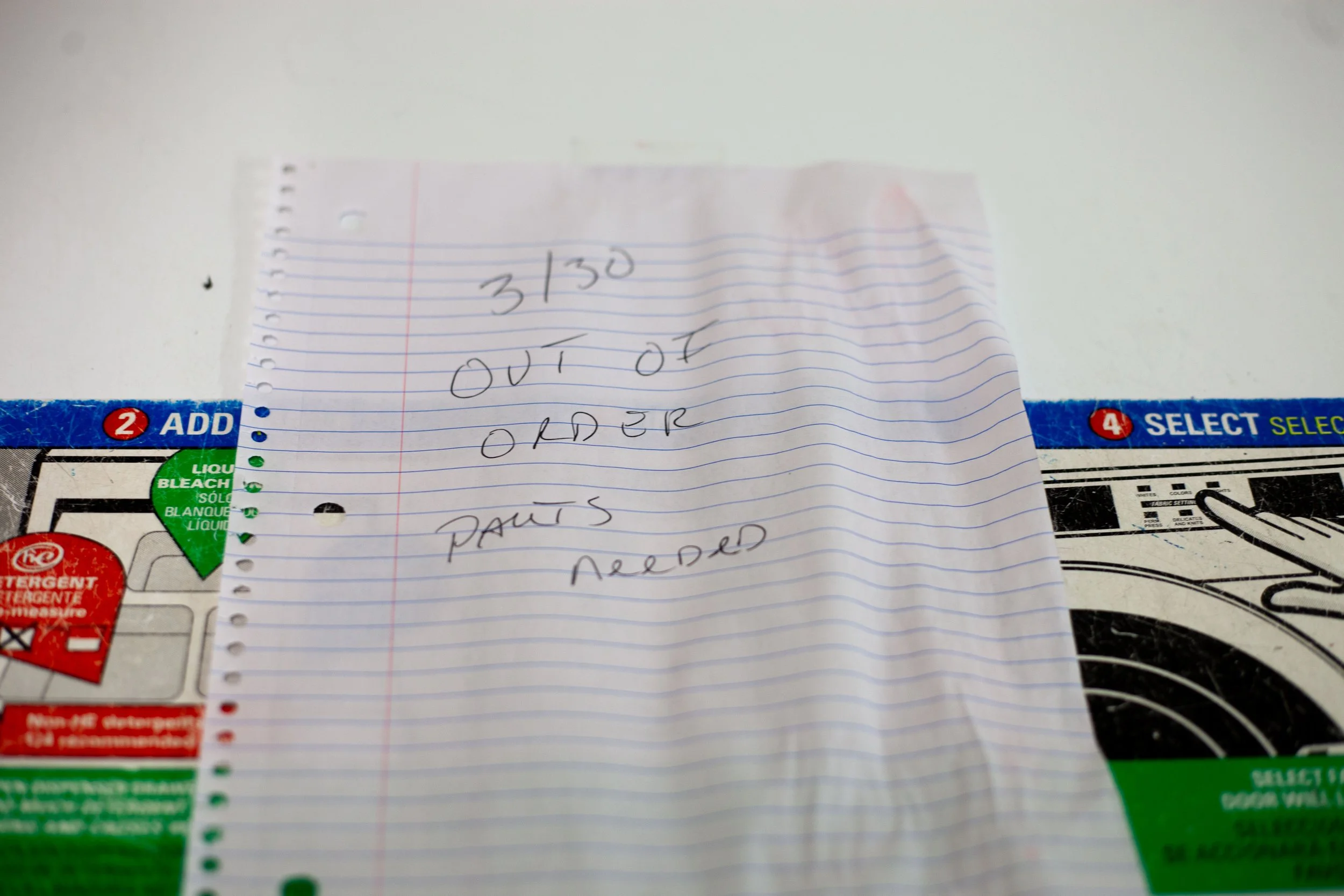 An note reading, “3/30 Out of Order, Parts Needed” on top of a CSC washer at Warren Wilson College (WWC) on March 31, 2026 in Swannanoa, N.C. (Echo/Emma Taylor McCallum)