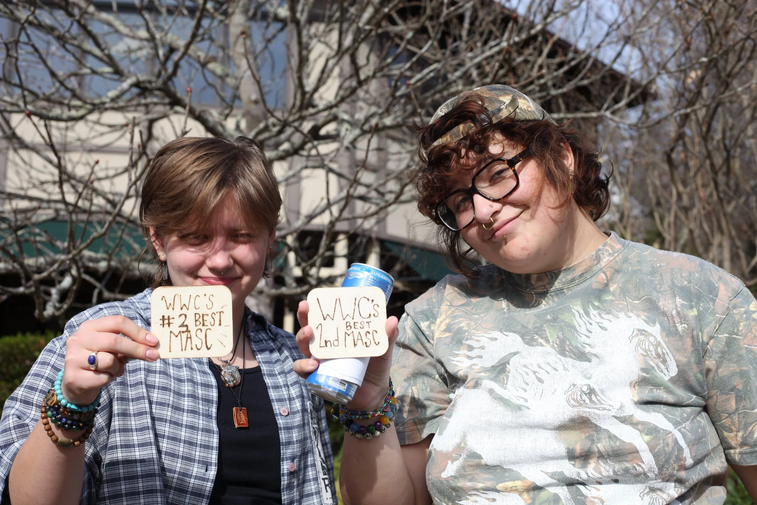 Rena Curtis, left, and Mazzaroth Carroll, right, pose with their awards at the Warren Wilson College (WWC) performative masc contest on November 18, 2025. (Echo/Emma Taylor McCallum)