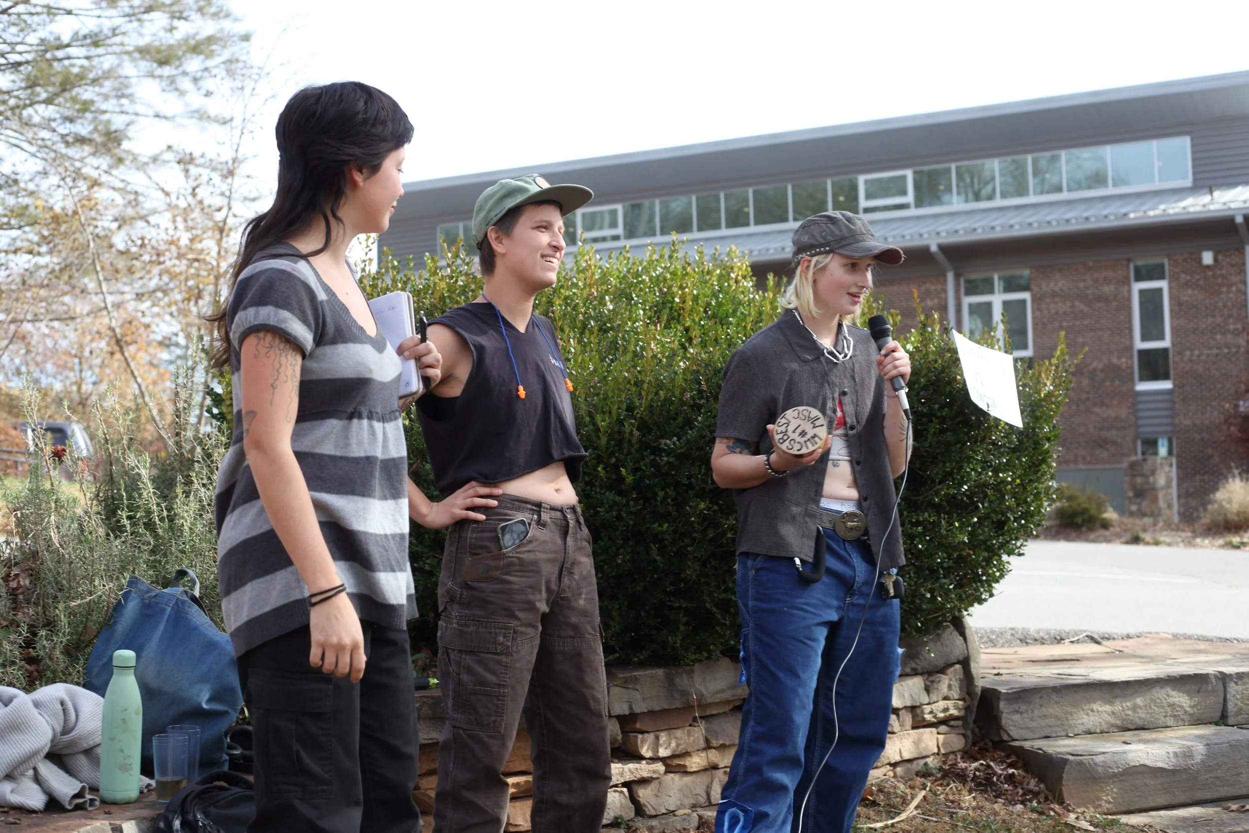 Organizers Alex Valenzuela, left, and Sal Ward, center, stand with performative masc competition winner Ursula Curlin on Cowpie Lawn in Swannanoa, N.C. on November 18, 2025 (Echo/Emma Taylor McCallum)