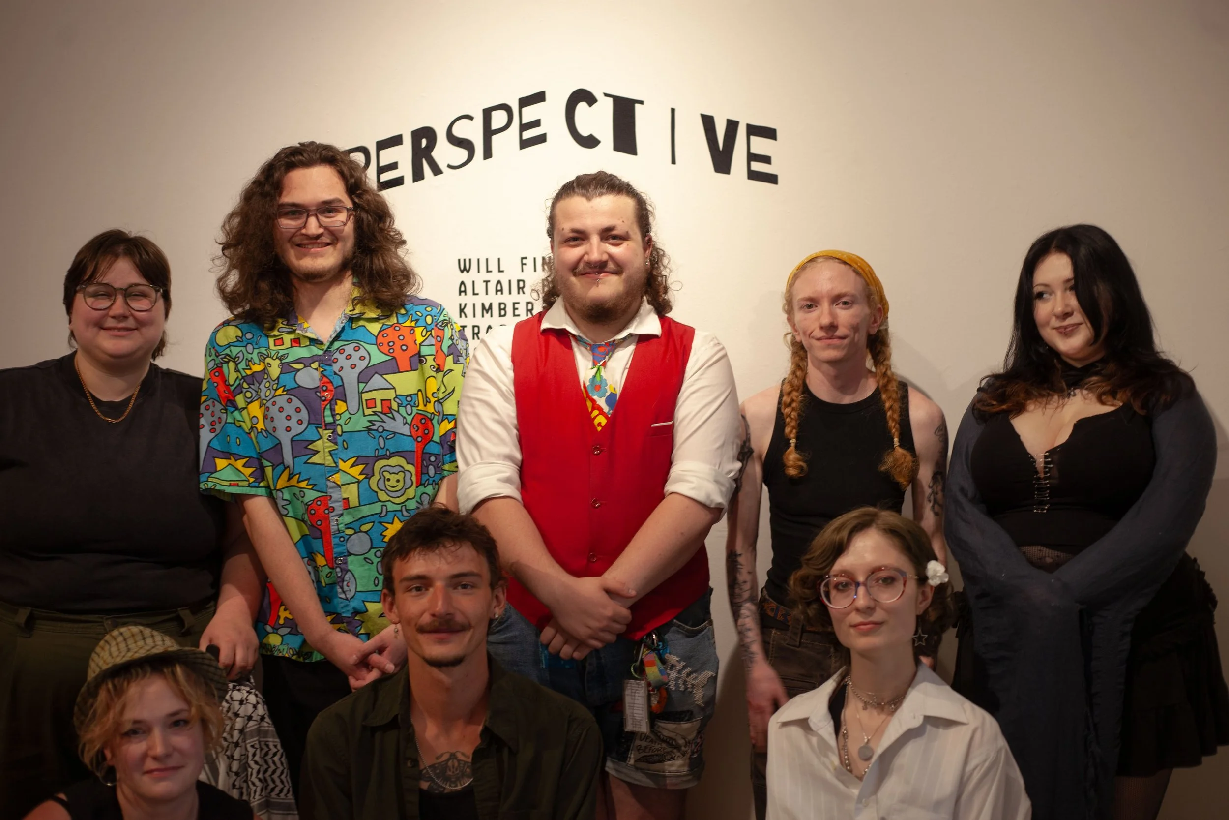 From left to right: Kimber Gada, Trace Howard, Will Finch, Ennis Shepherd, Blue Wilkinson, Kathryn Cellerini Moore, Goob Jefferson and Altair Barlow pose for a photo inside of the Holden Art Gallery at Warren Wilson College (WWC) on Friday, April 3, in Swannanoa, N.C. (Echo/Emma Taylor McCallum)