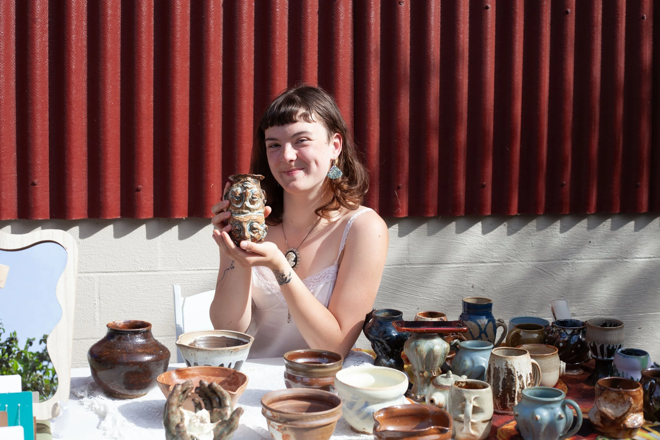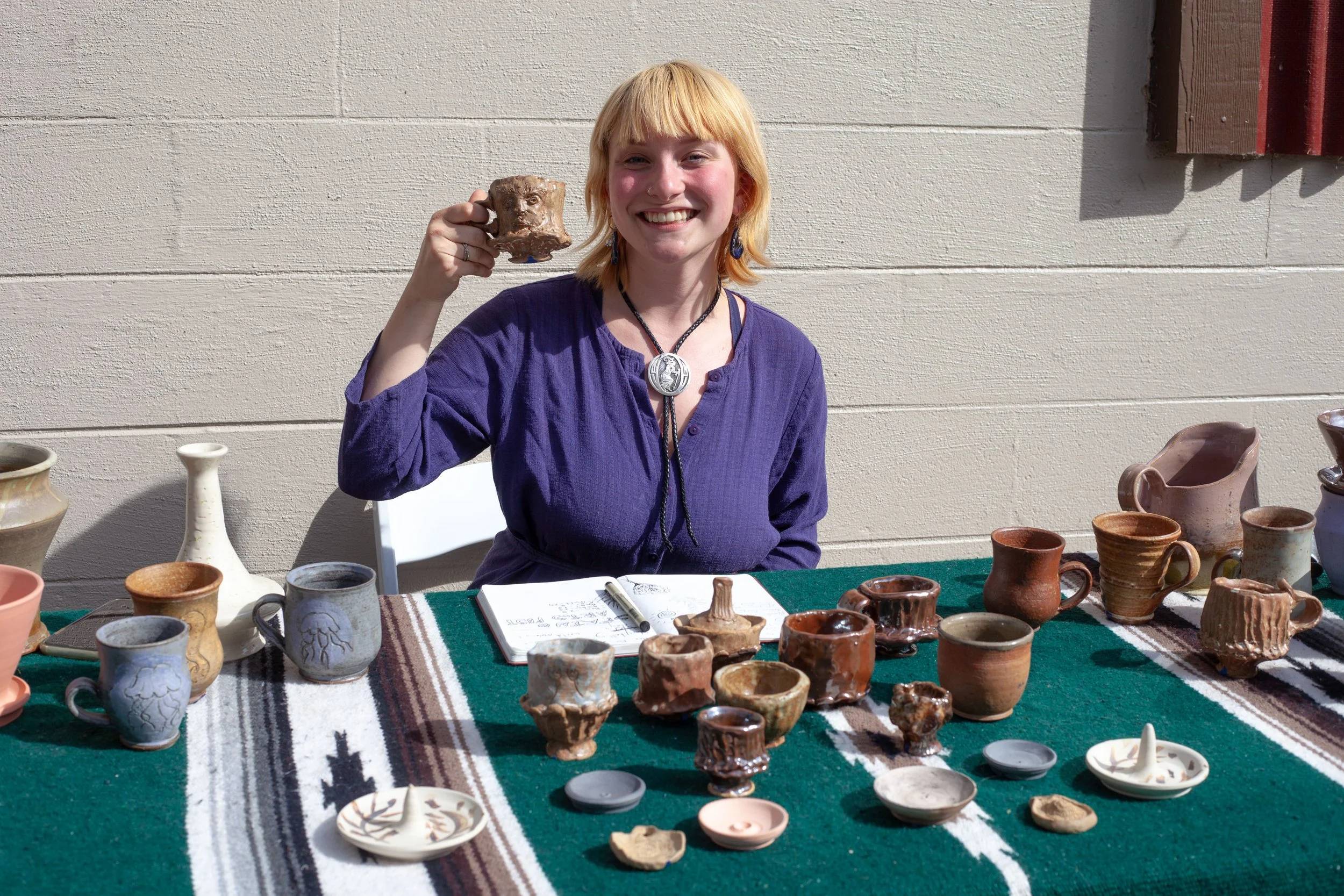 Vienna Paulsen poses with their work at the annual Spring Arts Sale where student artists sell their work at Warren Wilson College, on April 21, 2026 in Swannanoa, N.C. (Echo/Emma Taylor McCallum)