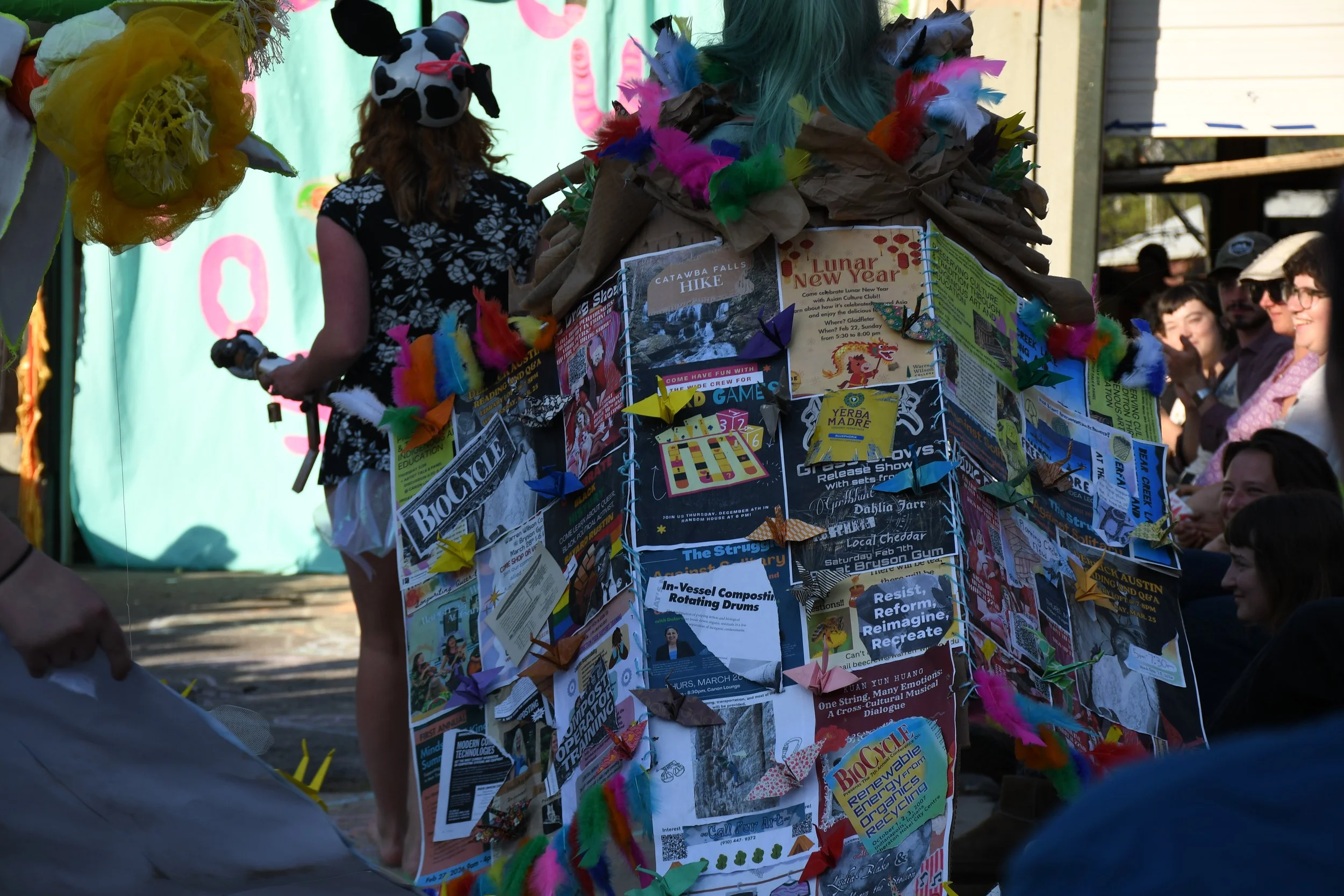 Fae Elkin models a cape crafted from recycled flyers posted around Warren Wilson College (WWC) at the Trashion Show in Swannanoa, N.C. on April 10, 2026. (Echo/Richmond Joyce)