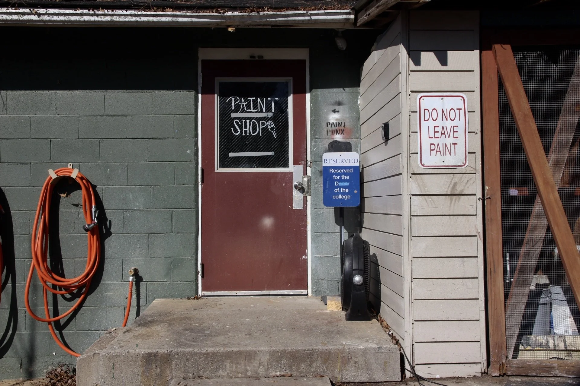 The front door of the Warren Wilson College (WWC) Paint Crew’s workspace in Swannanoa, N.C. (Vivian Bryan/Echo)
