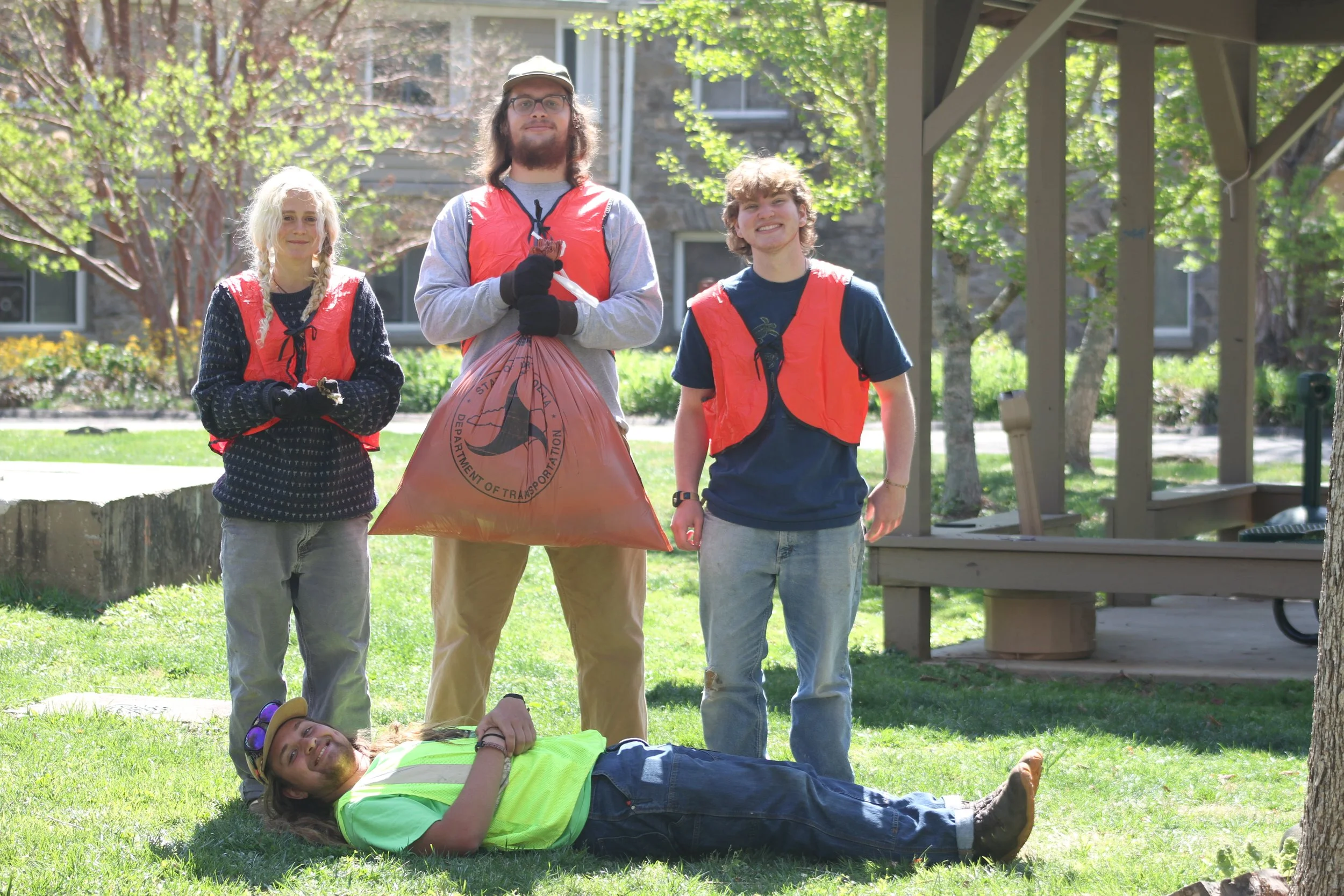 (From left) freshman Penelope Edgar, sophomore Sean Coyle, sophomore Sawyer Kairys and (bottom) sophomore Nolan Brown pose for a photo at Warren Wilson College (WWC) on Thursday, April 9, in Swannanoa, N.C. (Echo/Vivian Bryan)