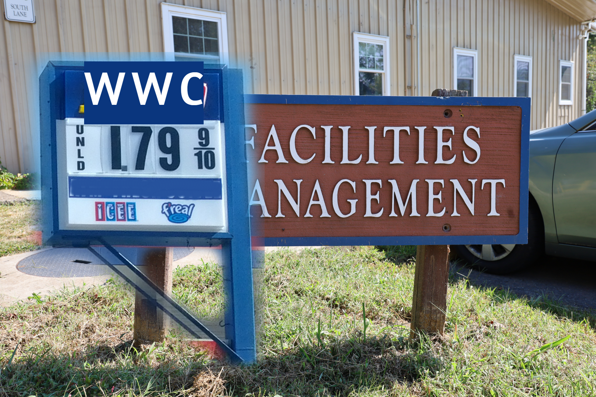 The newly installed gas signs at the Warren Wilson College (WWC) Facilities Management complex in Swannanoa, N.C. on April 1, 2026. (Neko Heinrich/Echo)