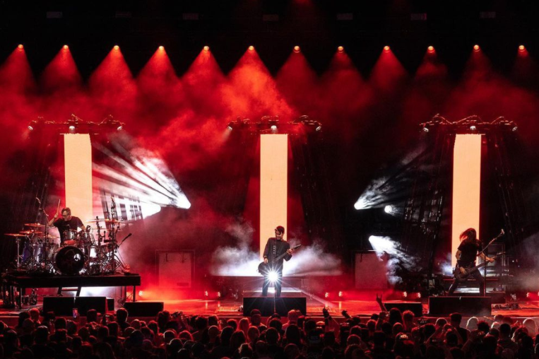 Left to right: Sam Loeffler, Pete Loeffler, and Kemble Walters of Chevelle performing at the Hollywood Palladium, October 2023 (photo by Josh Gordan).